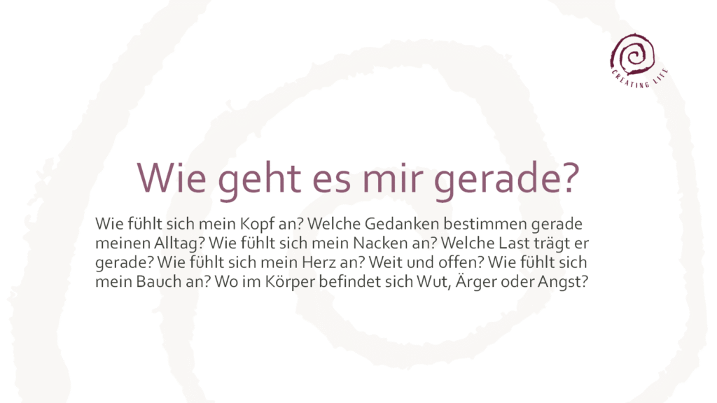 Verbindung mit Dir entsteht durch den Kontakt mit Deinem Körper. Wie oft sind wir in unseren Gedanken=Kopf unterwegs und spüren den Rest nicht mehr. Wir starten mit einem Body Scan. Setze Dich aufrecht hin, verankere Deine Füße gut im Boden. Spüre die Unterlage auf der du stehst oder sitzt. Schließe die Augen wenn Du willst, und richte Deine Aufmerksamkeit auf Deinen Körper: